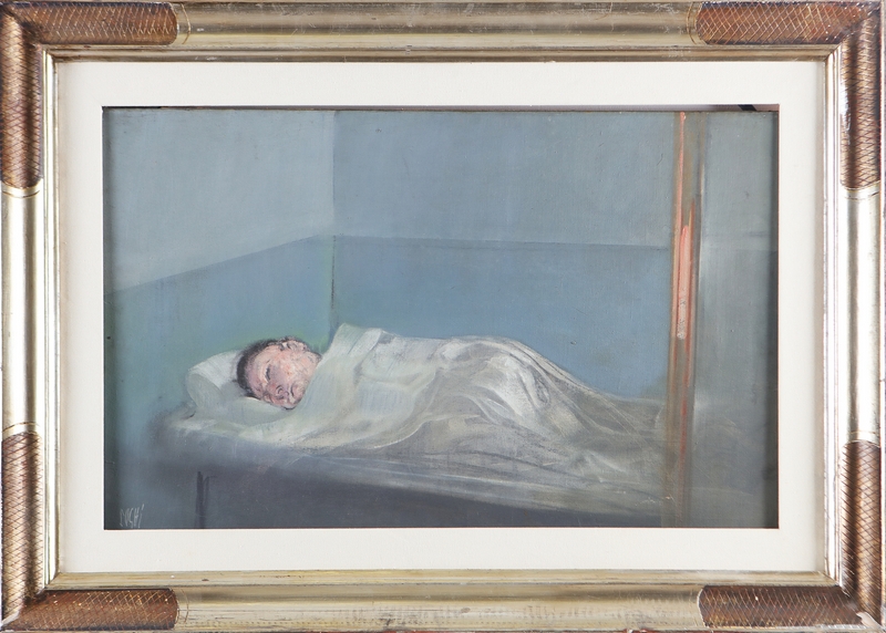 SUGHI ALBERTO (n. 1928) Dormiente. . 1964. Olio su tela . Cm 80,00 x 50,00. Firma in basso a sinistra. Al retro timbro a cura della Galleria 38 di Bergamo. Autentica dell'artista su fotografia. Certificato di autenticità a cura di Telemarket, Roncadelle, BS. . Cornice presente