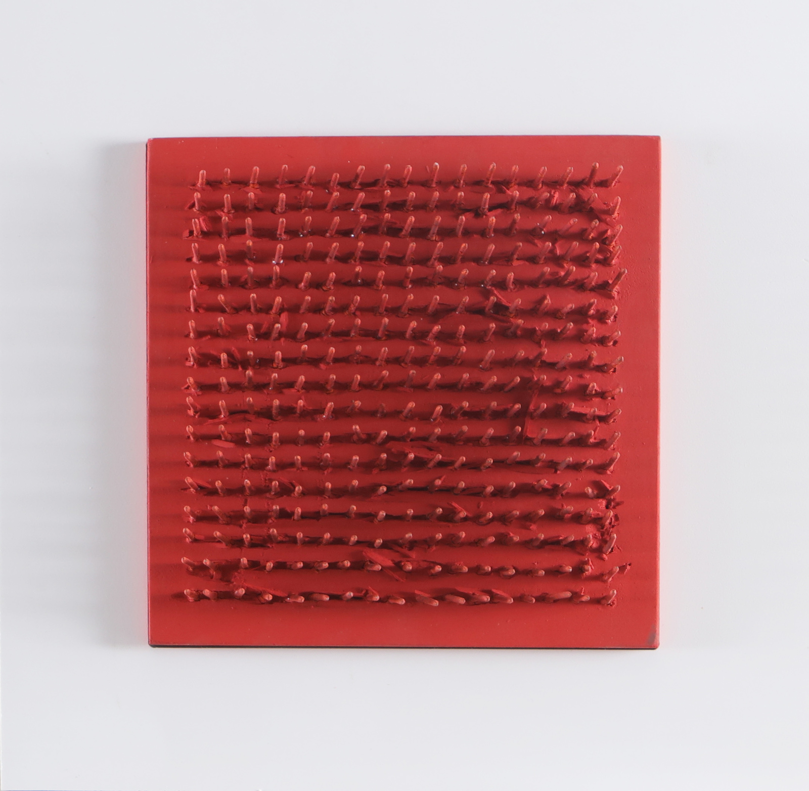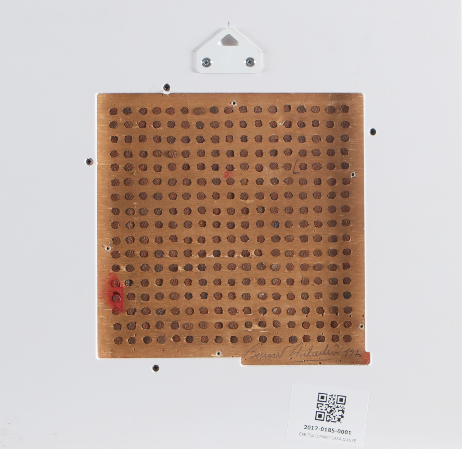 AUBERTIN BERNARD (1934 - 2015) Tableau Clous. 1970. Nails on panel. Cm 20,00 x 20,00. At the back signature and year. Bernard Aubertin Archives, Brescia, authenticity certificate on photo. Certificate of Authenticity and provenance by DG Art Gallery, Treviso. Cornice presente