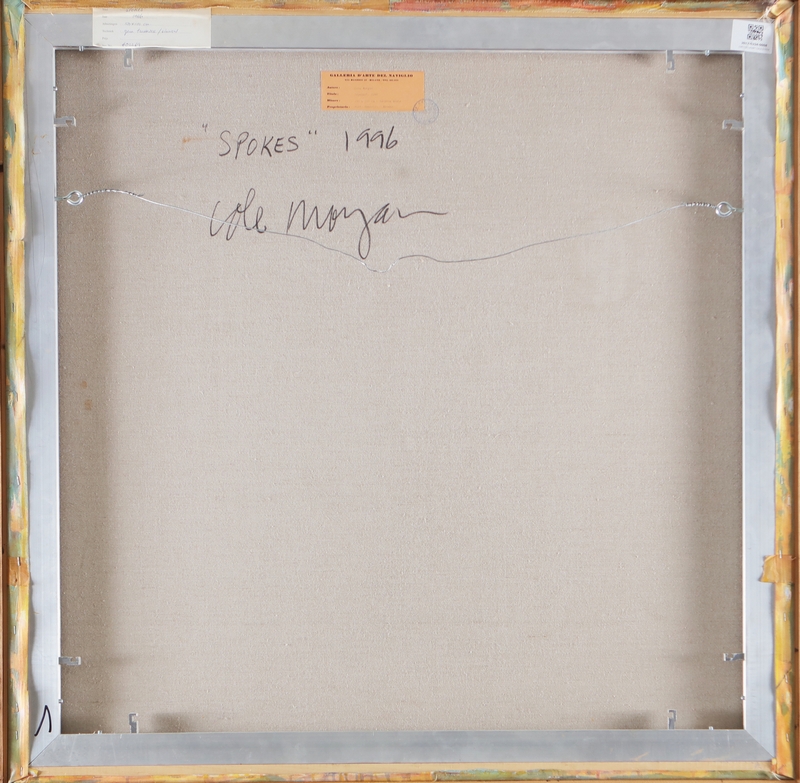 MORGAN COLE (n. 1950) Spokes. 1996. Tecnica mista su tela. Cm 100,00 x 100,00. Firma e anno in basso a destra. Al retro titolo, firma e anno. Cartiglio descrittivo a cura della Galleria d'Arte Naviglio, Milano. . Cornice presente