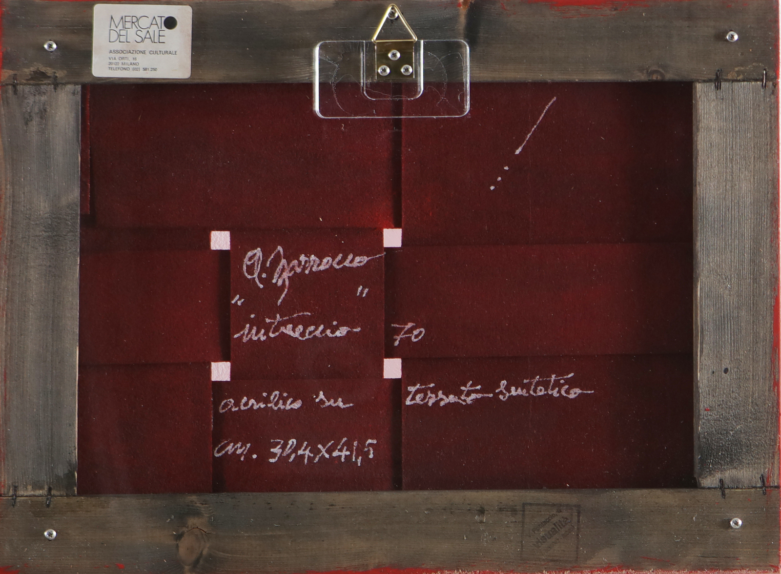 MARROCCO ARMANDO (n. 1939) Intreccio. 1970. Acrilico su tessuto. Cm 41,50 x 30,40. Al retro titolo, firma e anno. Cartiglio a cura dell'Associazione Culturale Mercato del Sale, Milano. Autentica dell'artista su fotografia. Opera contenuta in una teca di plexiglass.