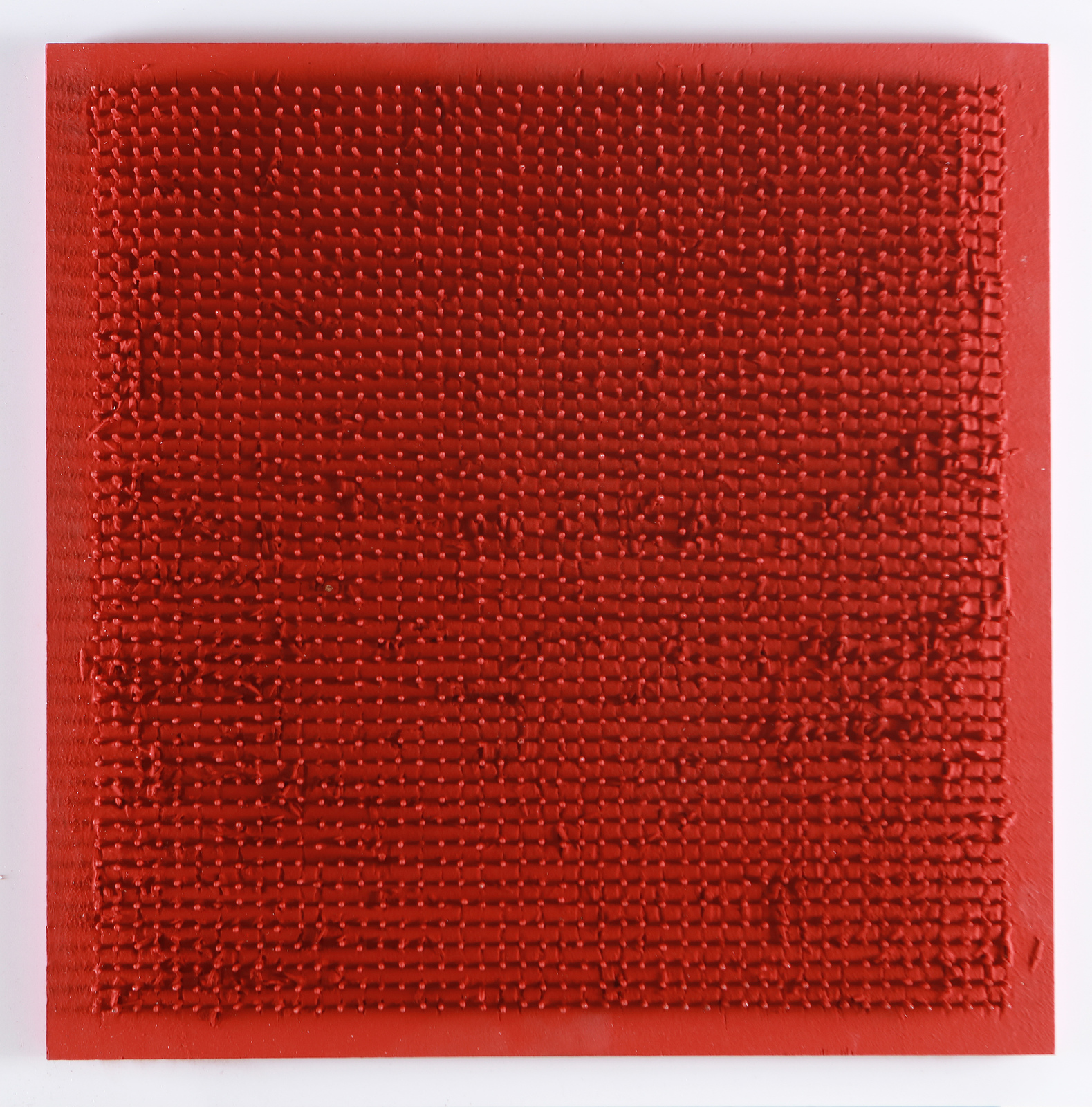 AUBERTIN BERNARD (1934 - 2015) Tableau Clous. . 1969. Chiodi su tavola. Cm 50,00 x 50,00. Firma, anno e timbro della Galleria Centro, Brescia. Autentica dell'artista su fotografia. Opera archiviata presso l'Archivio delle opere di Bernard Aubertin, Brescia, come da documentazione fotografica allegata all'opera riportante il relativo numero d'inventario. Cornice presente