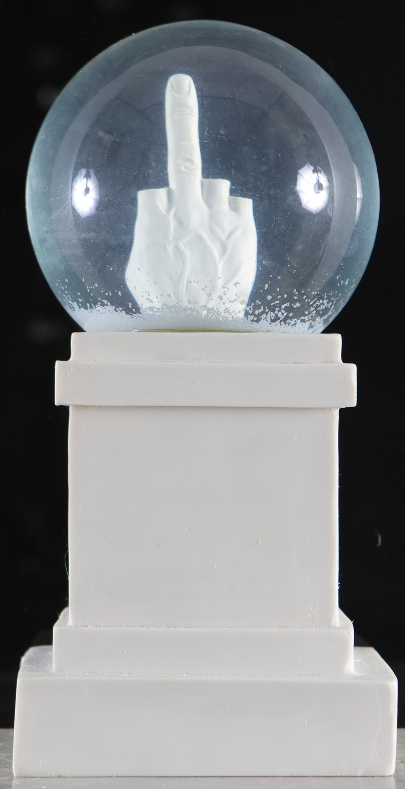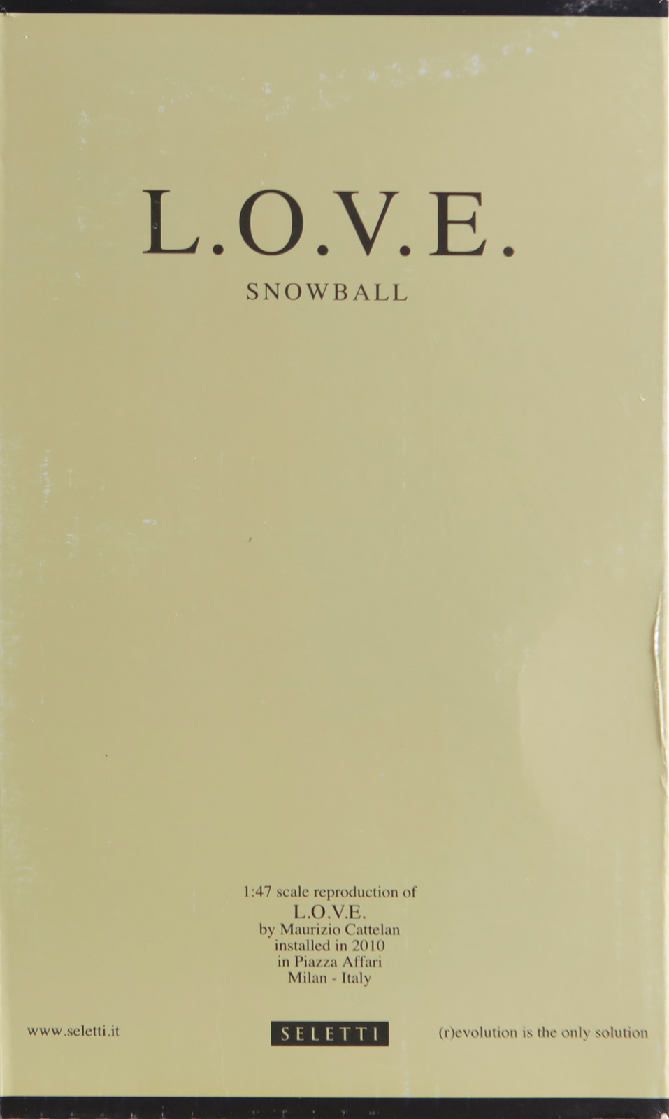 CATTELAN MAURIZIO (n. 1960) Snowball L.O.V.E. 2014. Vetro e resina. Cm 15,00 x 25,00. Riproduzione dell' opera monumetale di Maurizio Cattelan piazza affari. Prodotta da Seletti in 2000 esemplari in occasione di Milano fashion week 2014. Edizione esaurita. Confezione originale.