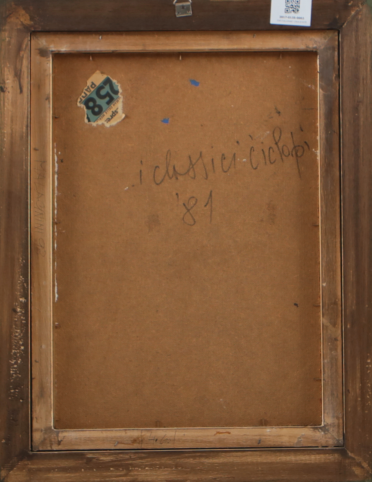 BERTINI GIANNI (1922 - 2010) I classici ciclopi. 1981. Tecnica mista su tavola. Cm 35,00 x 50,00. Firma in basso a destra. Al retro titolo e anno. Autentica dell'artista su fotografia. Cornice presente
