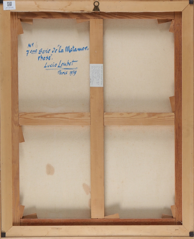 LOUBET LUCIO (n. 1927) Serie " La metamorfosi". 1971. Tempera su tela. Cm 86,00 x 105,00. Al retro titolo, firma e anno. Cartiglio descrittivo a cura della Galleria Nuovo Spazio, Mestre. Cornice presente