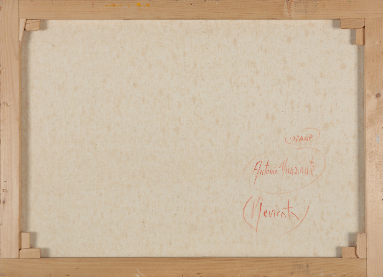 NUNZIANTE ANTONIO (n. 1956) Nevicata. . 1987. Olio su tela . Cm 70,00 x 50,00. Al retro firma e titolo. Opera archiviata presso l'Archivio fotografico generale delle opere di Antonio Nunziante, come documentazione fotografica allegata all'opera riportante il relativo numero di inventario. . Cornice presente