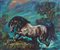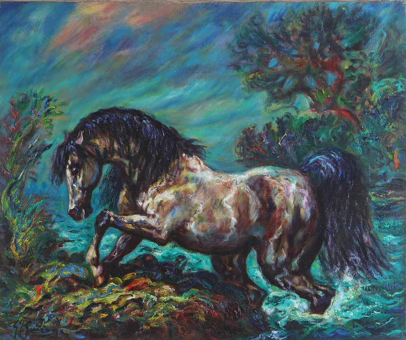 GONZAGA GIOVAN FRANCESCO (1921 - 2007) Corsiero uscente dalle acque. 1968. Olio su tela . Cm 60,00 x 50,00. Firma in basso a sinistra. Al retro titolo, firma e anno. Pubblicazione: G.F. Gonzaga, catalogo della mostra presso la Galleria d'Arte Il Vertice, Milano, tenuta dal 16 al 30 Novembre 1968. Cornice presente