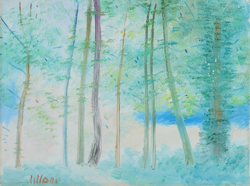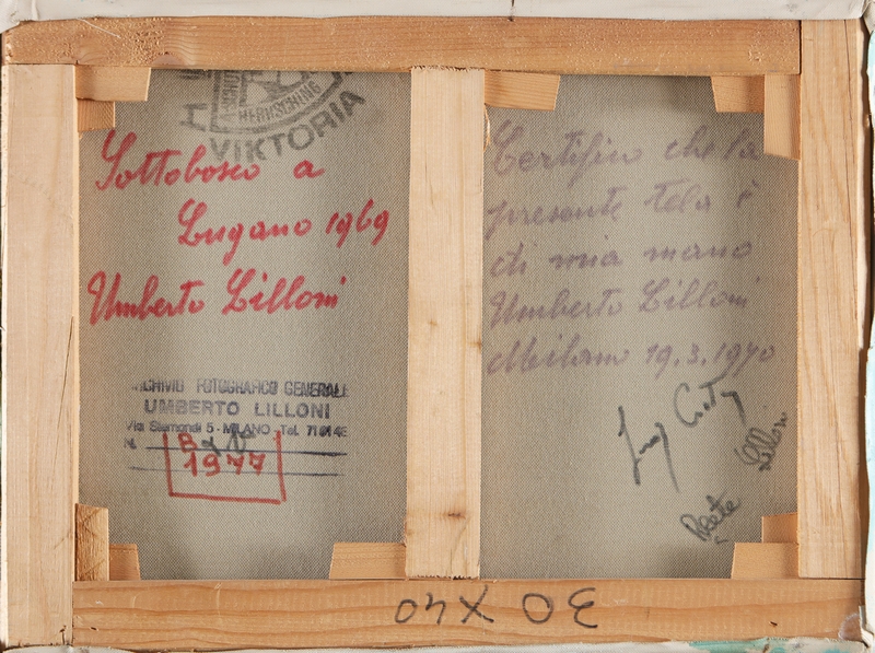 LILLONI UMBERTO (1898 - 1980) Sottobosco a Lugano. 1969. Olio su tela . Cm 40,00 x 30,00. Firma in basso a sinistra. Firma titolo e anno al retro. Timbro a cura dello Studio Lilloni, Milano. Opera archiviata presso l'archivio delle opere dell'artista, Milano, come da documentazione fotografica allegata all'opera riportante il relativo numero d'inventario. Cornice presente