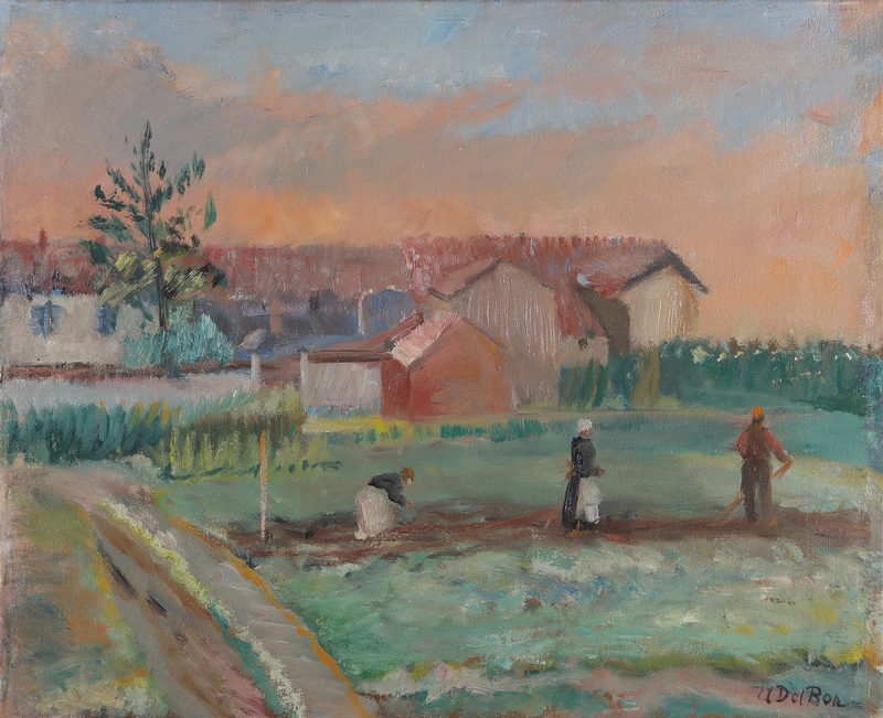 DEL BON ANGELO (1898 - 1952) Campagna milanese. 1929. Olio su tela . Cm 55,00 x 45,00. Firma in basso a destra. Autentica su fotografia della Galleria d'Arte Moderna Lo Spazio, Brescia. Pubblicazione: a cura di Massimo Carrà e Giuseppe Marchiori, Del Bon, Giulio Bolaffi Editore, 1977, p.96. . Cornice presente