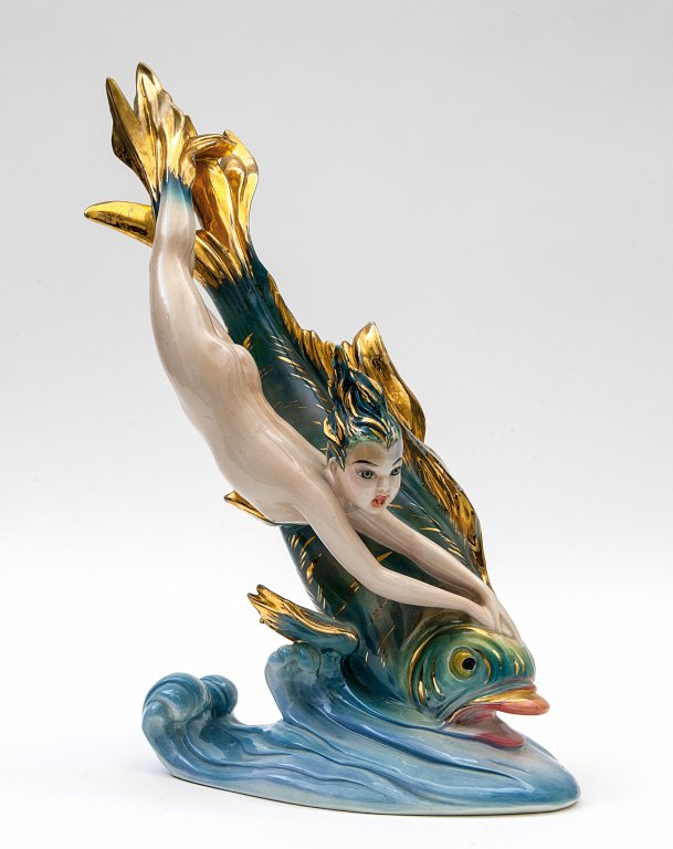 A. PANNUNZIO Figura di sirena con pesce, anni '50. Ceramica decorata. Altezza...