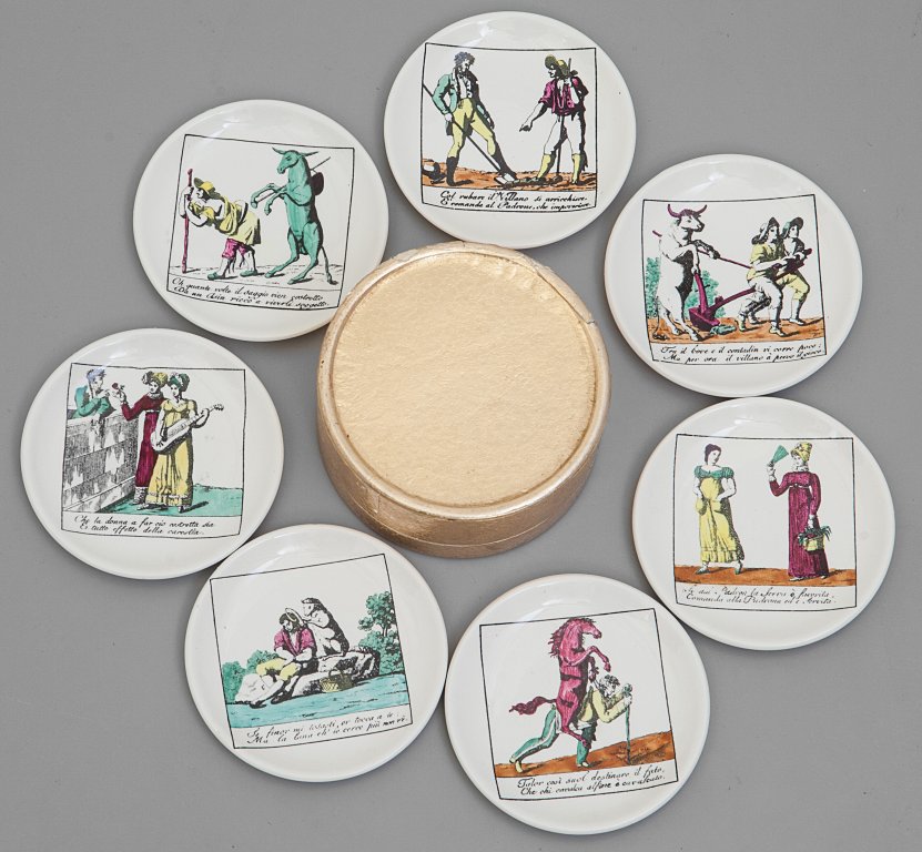 PIERO FORNASETTI7 sottobicchieri della serie "Il mondo alla rovescia", anni...