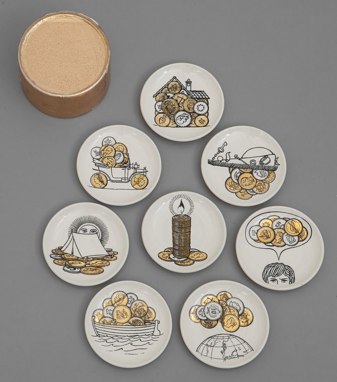 PIERO FORNASETTIOtto sottobicchieri decoro "Monete", anni '60. Porcellana...