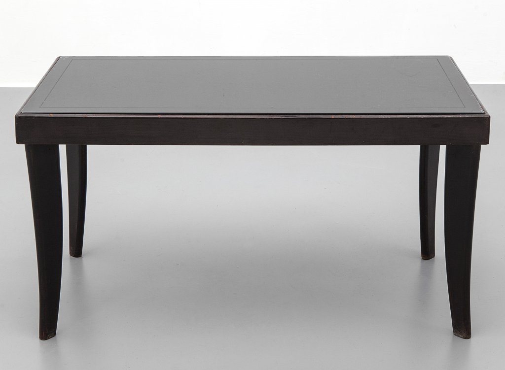 UN TAVOLINO, anni '40. Legno tinto all'anilina, cristallo con carta colorata...