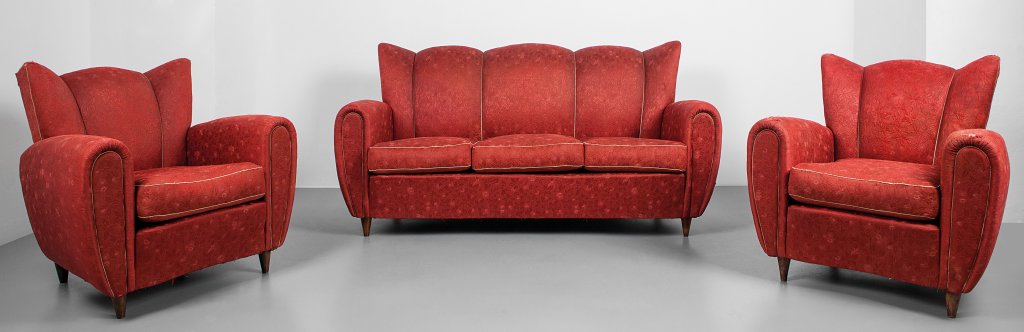 UN DIVANO E DUE POLTRONE, anni '40. Struttura e gambe in legno, imbottiture...