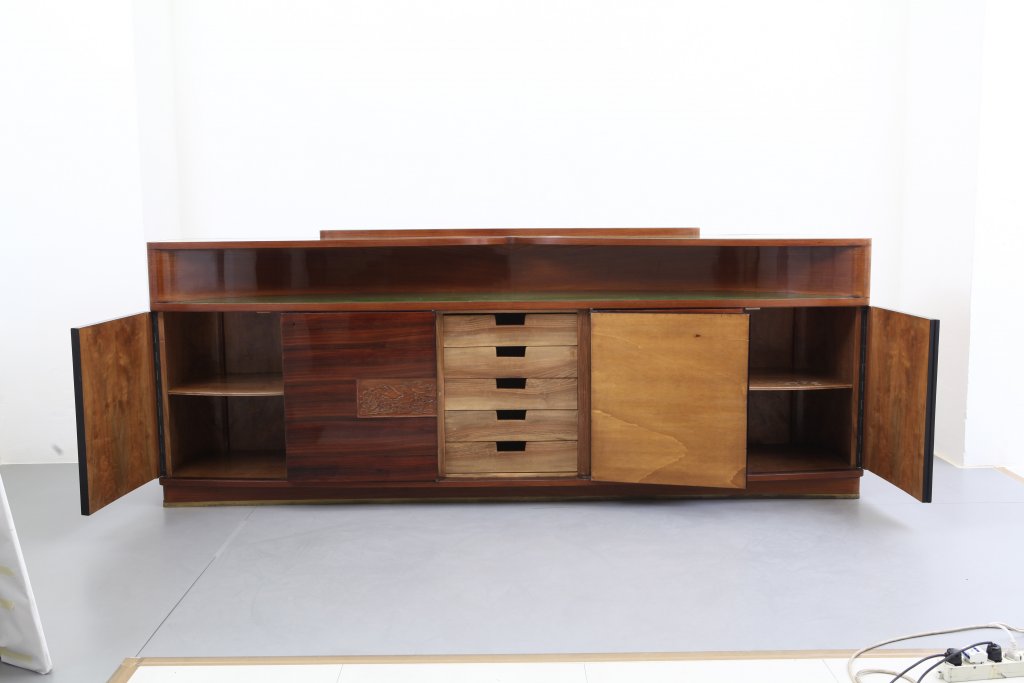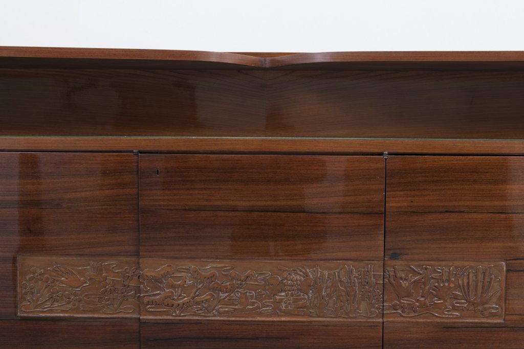 UNA CREDENZA, anni '50. Legno impiallacciato in palissandro con pannello...