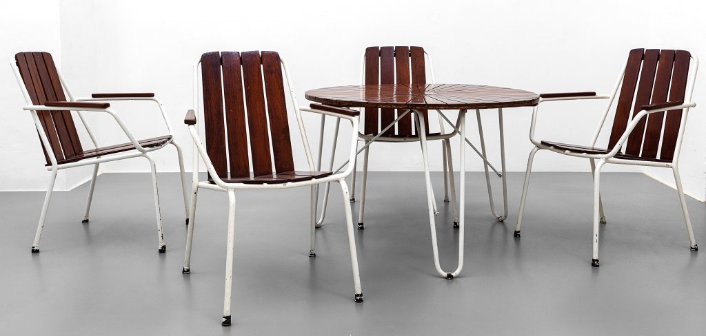 UN TAVOLO E QUATTRO POLTRONCINE DA ESTERNO, anni '50.