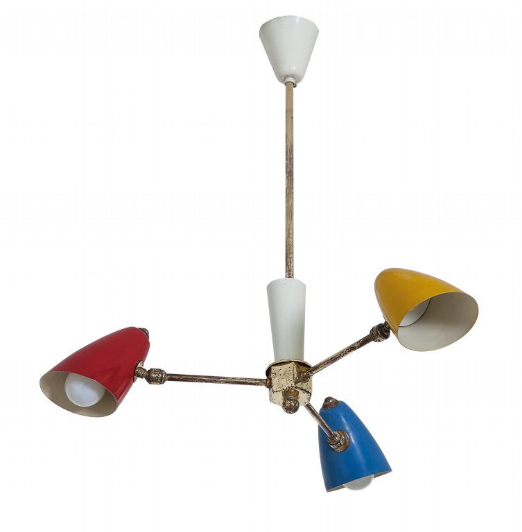 UNA LAMPADA A SOSPENSIONE, anni '50. Ottone, alluminio laccato. Altezza cm...