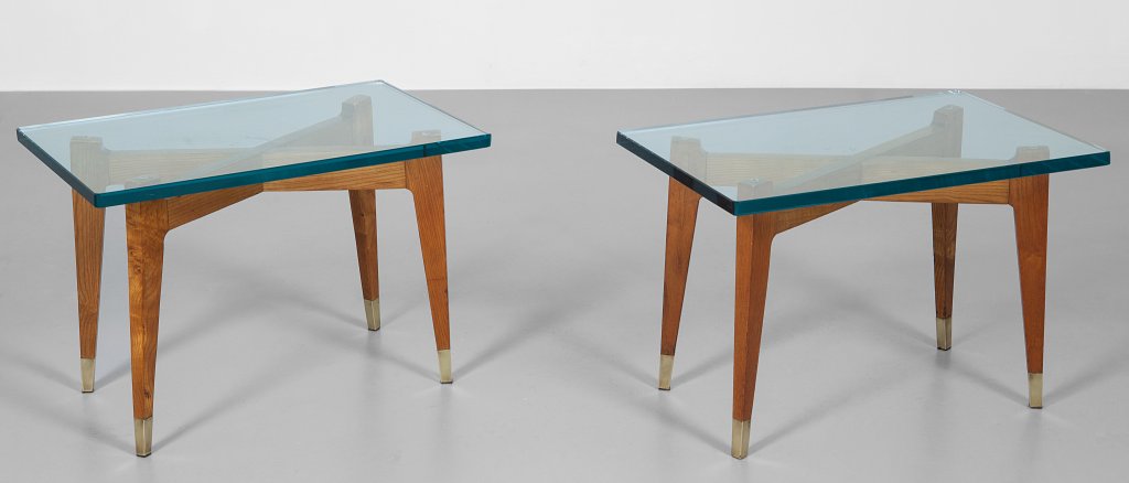 DUE TAVOLINI, anni '50. Legno di rovere, cristallo di forte spessore. Cm 38...