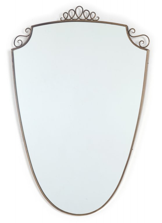 UNO SPECCHIO DA PARETE, anni '50. Ottone, cristallo argentato. Cm 86 x 58.