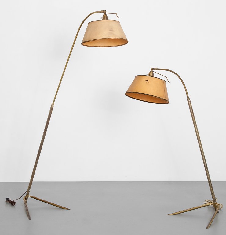 DUE LAMPADE DA TERRA, anni '50. Ottone, steli telescopici, paralumi di carta....