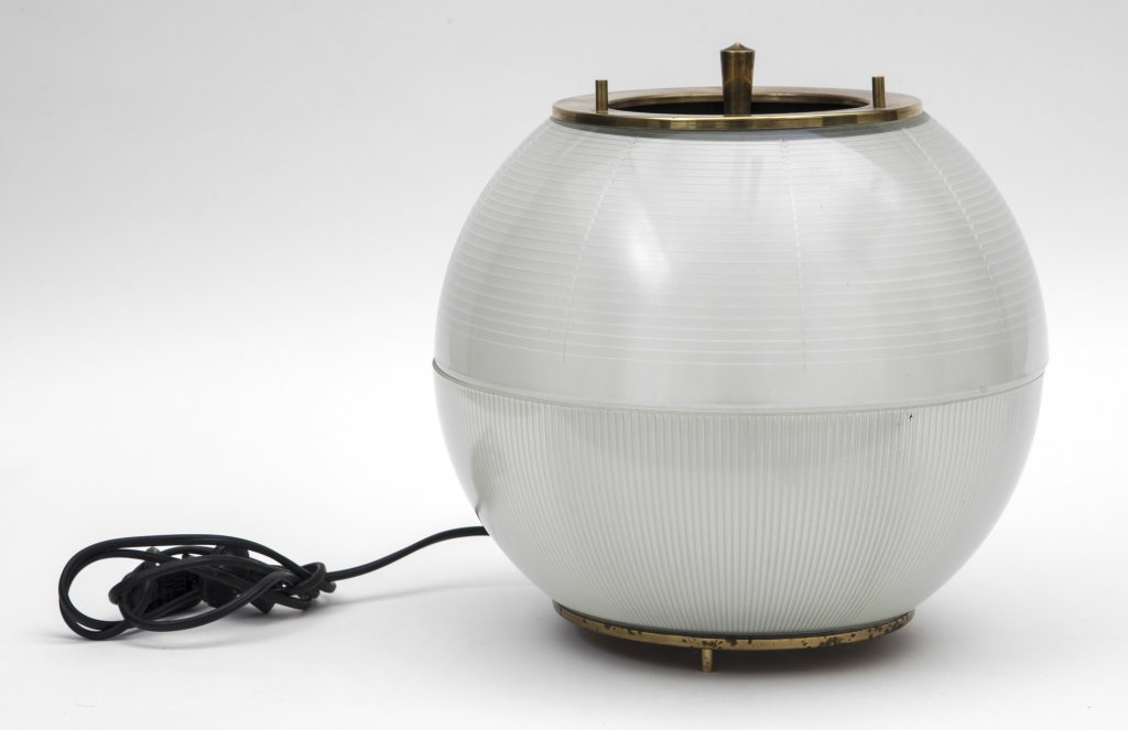 UNA LAMPADA DA TAVOLO, anni'60.Ottone, vetro stampato.Diametro cm 30.