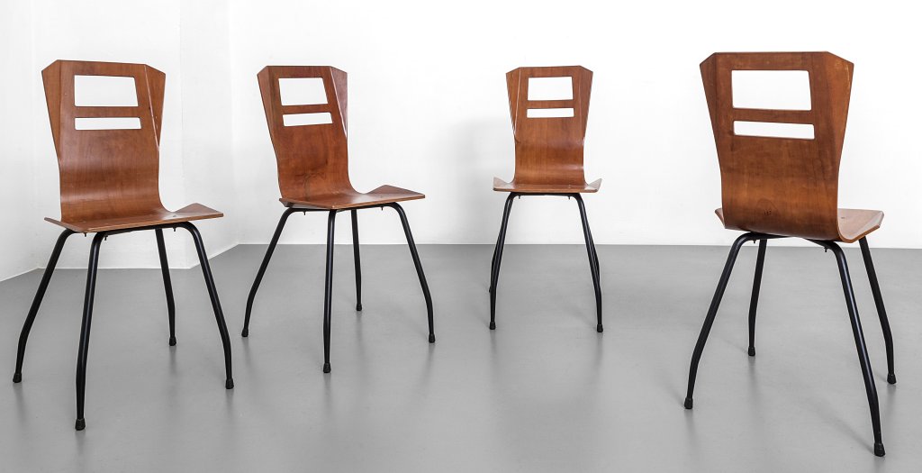 QUATTRO SEDIE, anni '60. Tubo di ferro verniciato, compensato di mogano...