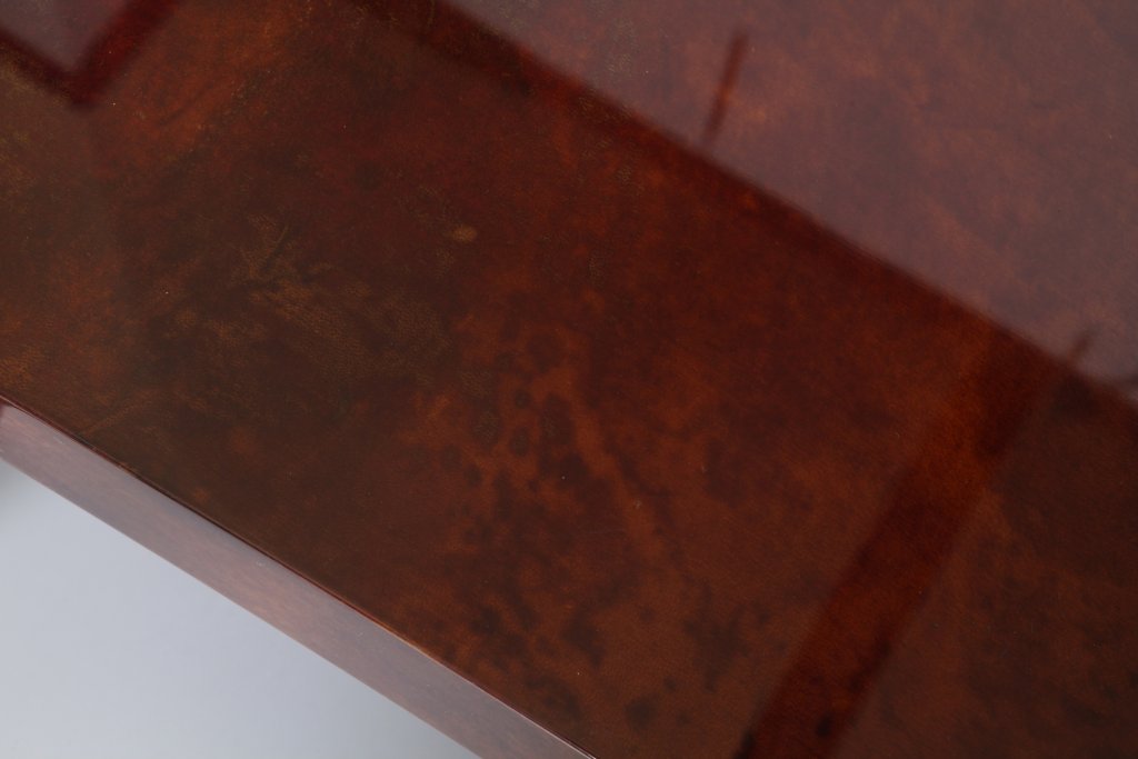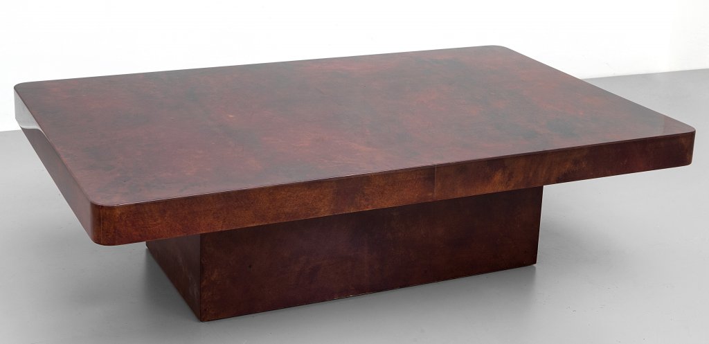 ALDO TURA Un tavolino, anni '70. Legno rivestito in pergamena tinta...