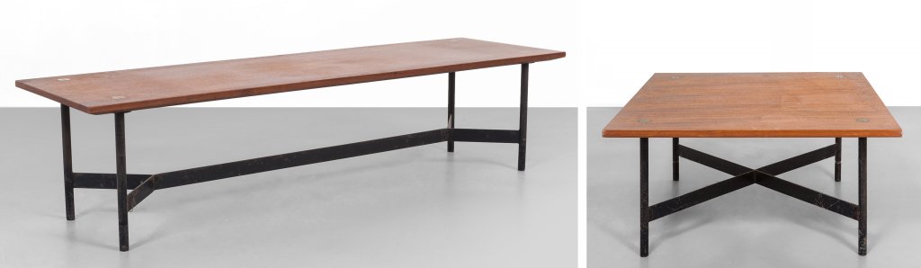 DUE TAVOLINI, anni '60. Ferro verniciato, ottone, legno impiallacciato in...