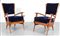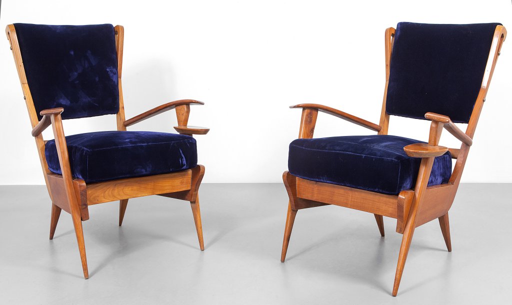 DUE POLTRONE, anni '60. Legno di ciliegio, imbottiture rivestite in velluto....
