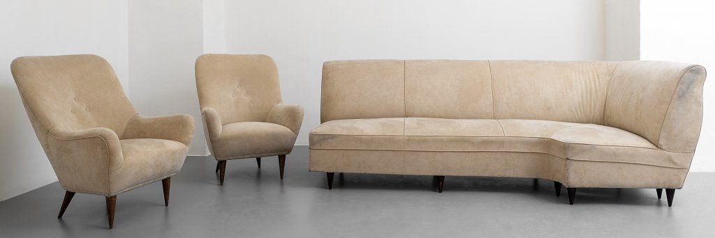 Lot 4436 | UN SOFA E DUE POLTRONE, anni '60. Struttura e gambe in legno, imbottiture...
