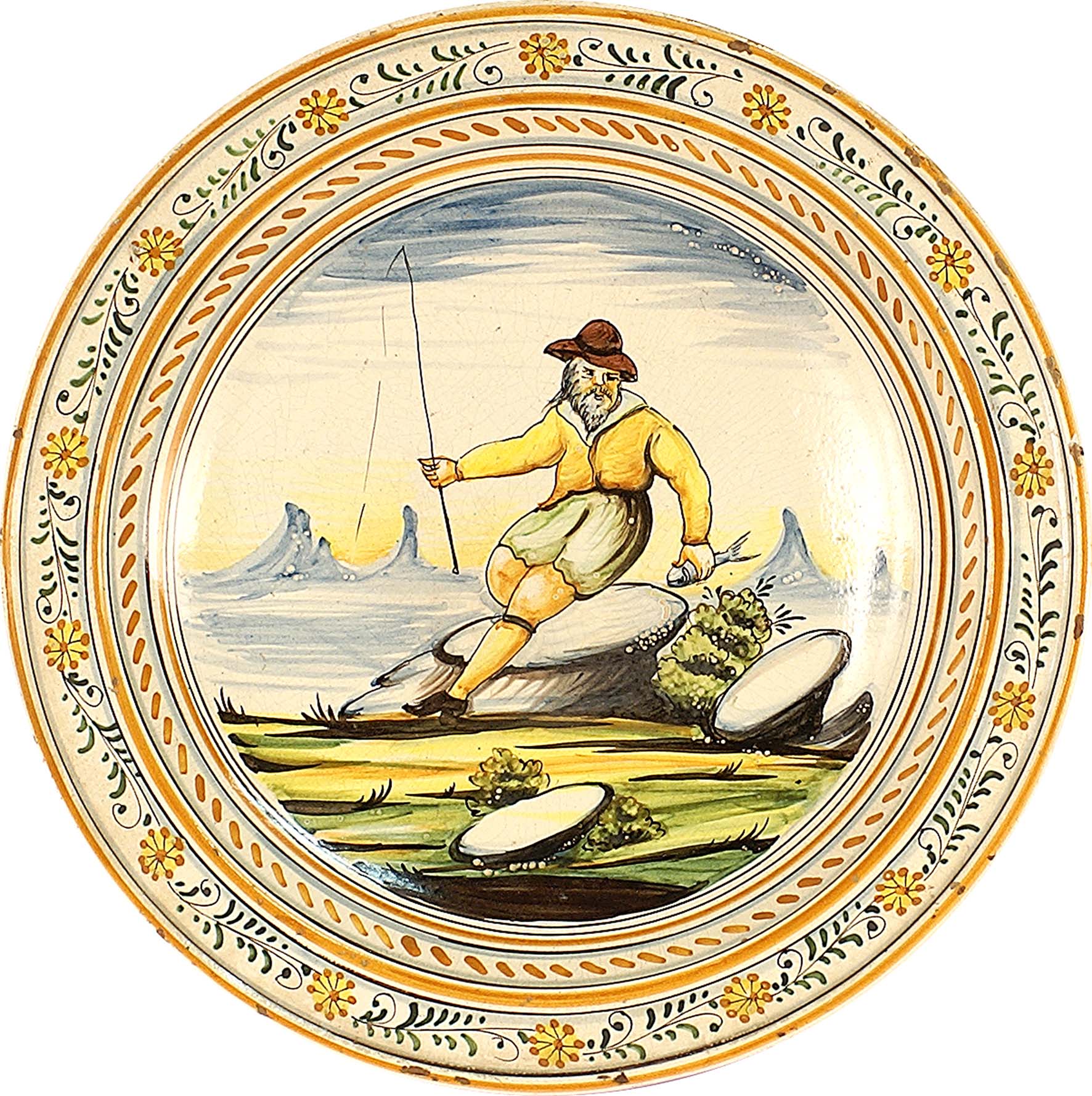 Piatto in maiolica decorata a policromia con al centro un paesaggio con pescatore, vecchia manifattura, d. cm. 49.