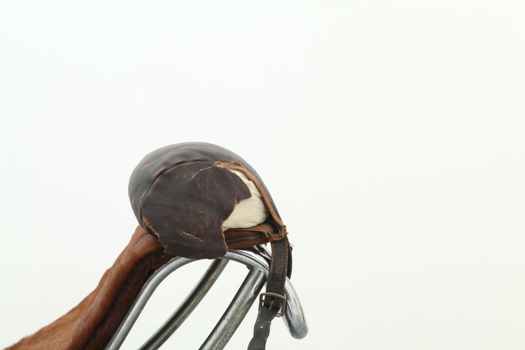 Acciaio verniciato, tubo di acciaio cromato, materassino rivestito in pelle con pelo, appoggiato su nastri elastici, poggiatesta rivestito in pelle.