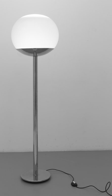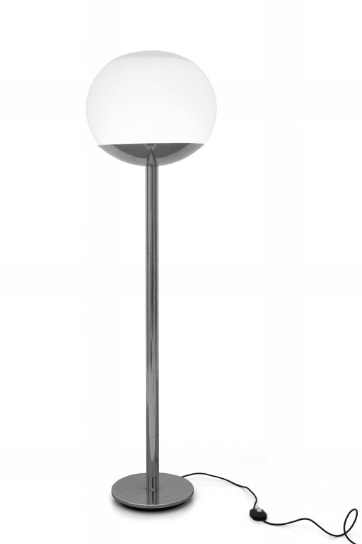 UNA LAMPADA DA TERRA, circa 1970. Acciaio cromato, vetro opalino. Altezza cm...