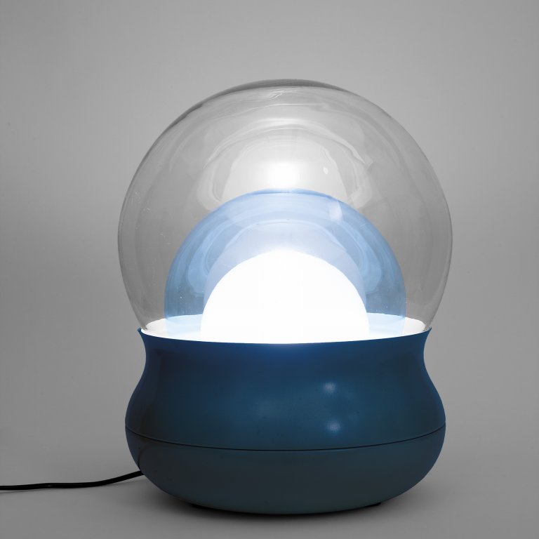 Lacquered aluminum, frosted opaline glass, and coloured crystal.