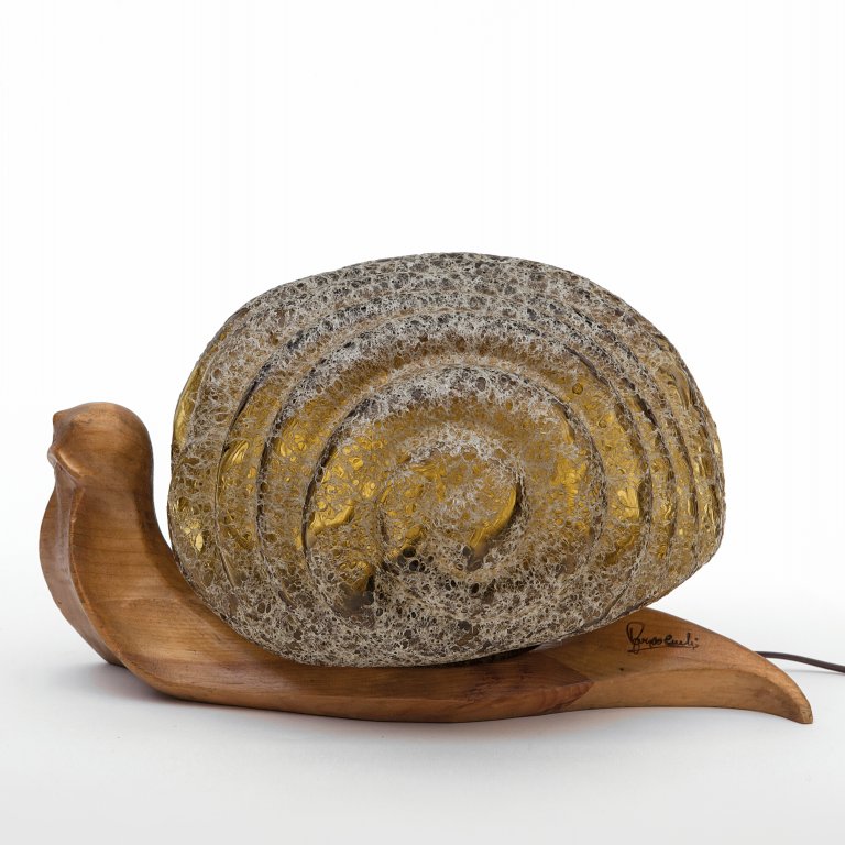 Carved wood and acid treated blown glass, with the imprinted Author's signsture.