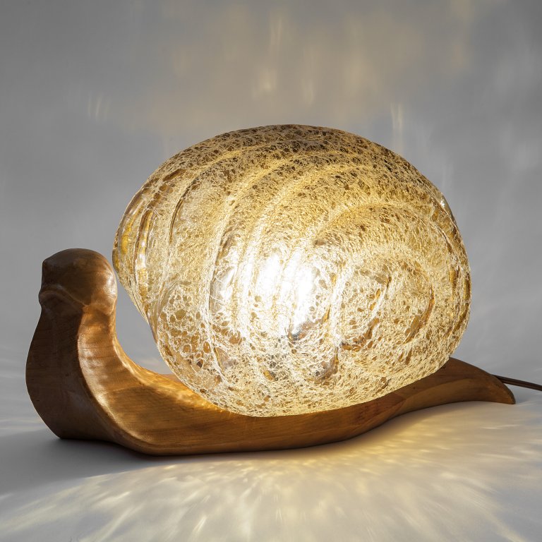 Legno intagliato, vetro soffiato in stampo trattato all'acido.