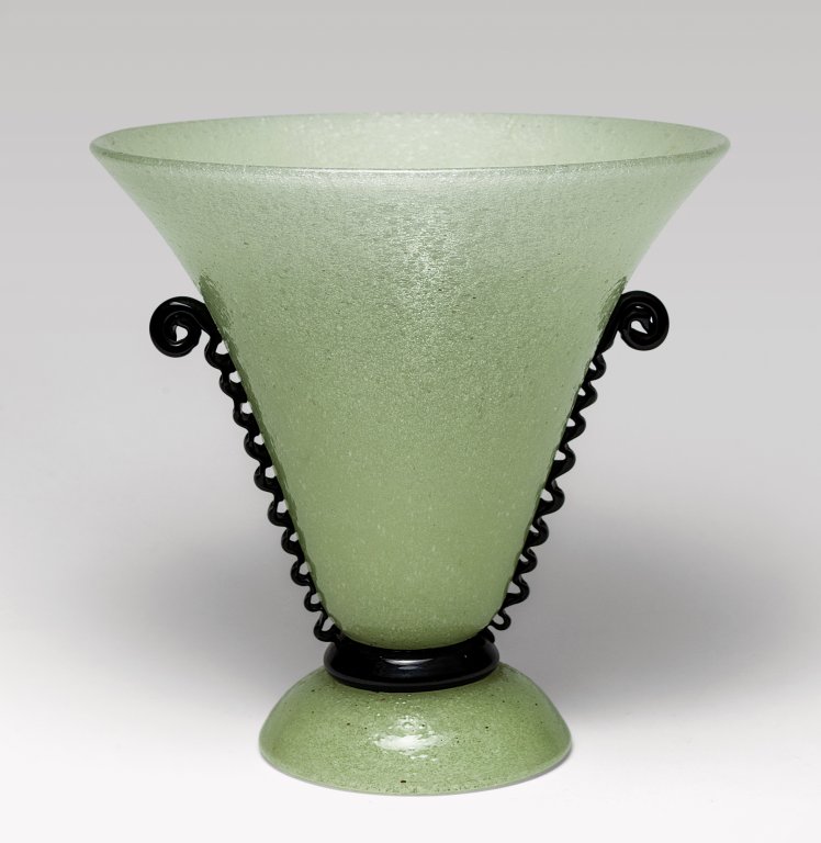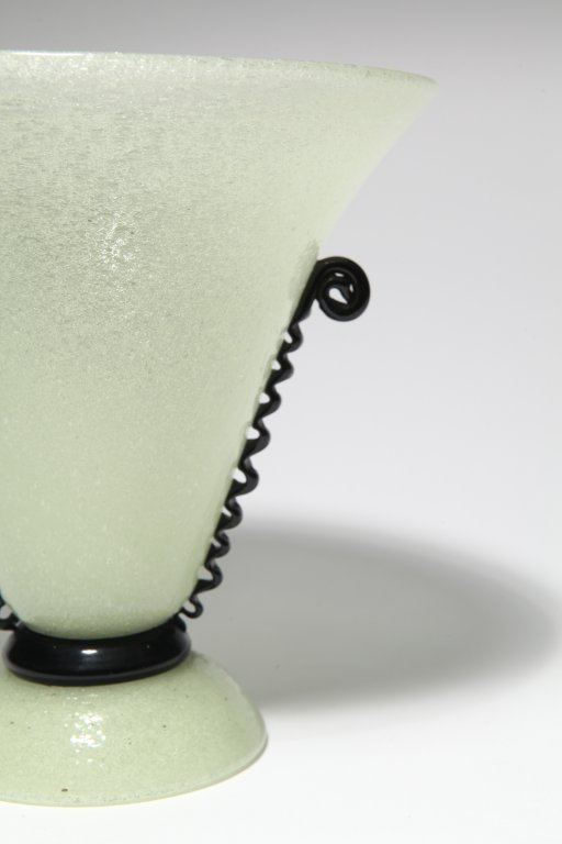 MURANO, circa 1930. Un vaso in vetro pulegoso con applicazioni di vetro nero....