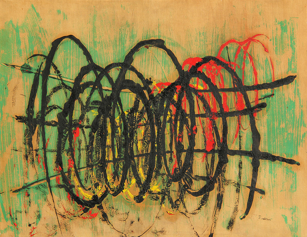 Roberto CRIPPA (Monza 1921 Bresso 1972) Spirali, anni 50, olio su carta intelata, cm. 44 x 57.5, G. Stefanini, R. Crippa Jr. 'Roberto Crippa. Catalogo generale delle opere', Edizioni Galleria Pace, Milano, 2013, tomo II, p. 193, rep. 1011, Etichetta della Galleria delle Ore , Milano; #etichetta dell'Archivio Roberto Crippa (al retro) Autentica dell'Archivio Roberto Crippa a firma del figlio Roberto Crippa Jr. con numero di repertorio 1011