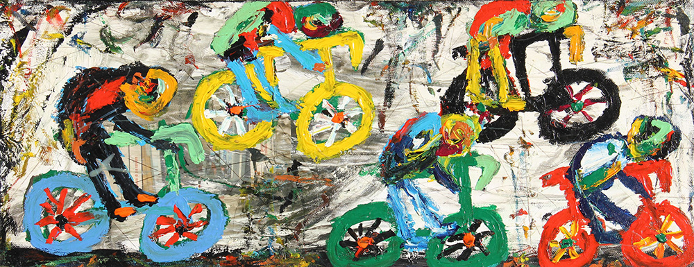 Fabrizio MOLINARIO (Novara, 1968 1968 ) Gruppo ciclisti, 2010, tecnica mista su tela, cm. 30 x 80, Firma, titolo, data 'Fabrizio Molinario, Gruppo ciclisti, 2010'; #timbro dell'artista (al retro) Autentica dell'artista su fotografia