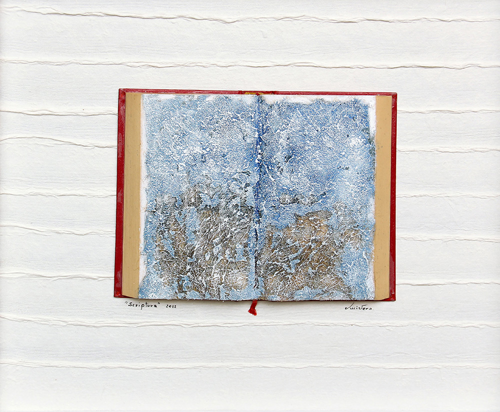 Antonio LUCIVERO (Napoli, 1962 ) Scriptura, 2012, libro, acrilico e carta fatta a mano su tavola, cm. 40 x 45, Titolo, data 'Scriptura, 2012' (in basso a sinistra); #firma 'Lucivero' (in basso a destra) #Titolo, data, tecnica, misure, firma, scritta 'Concetto della conoscenza, Scriptura, 2012, T.M. su libro, mis. 19x25 libro, mis. 39x45 totale, x autentica Antonio Lucivero, arc. n. Sc 012/411, Grazie per aver portato la mia pittura nel tuo spazio, Antonio'; #certificato di autentica dell'artista (al retro)