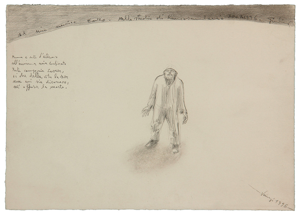 Giuliano VANGI (Barberino del Mugello 1931 ) Senza titolo, 1995, grafite su cartoncino, cm. 25.5 x 34.5, Dedica, luogo, data, firma 'Al mio amico Enzo, nello studio di Roncosambaccio, 30-7-1996, Giuliano Vangi' (in alto); #firma, data 'Vangi, 1995' (in basso a destra)