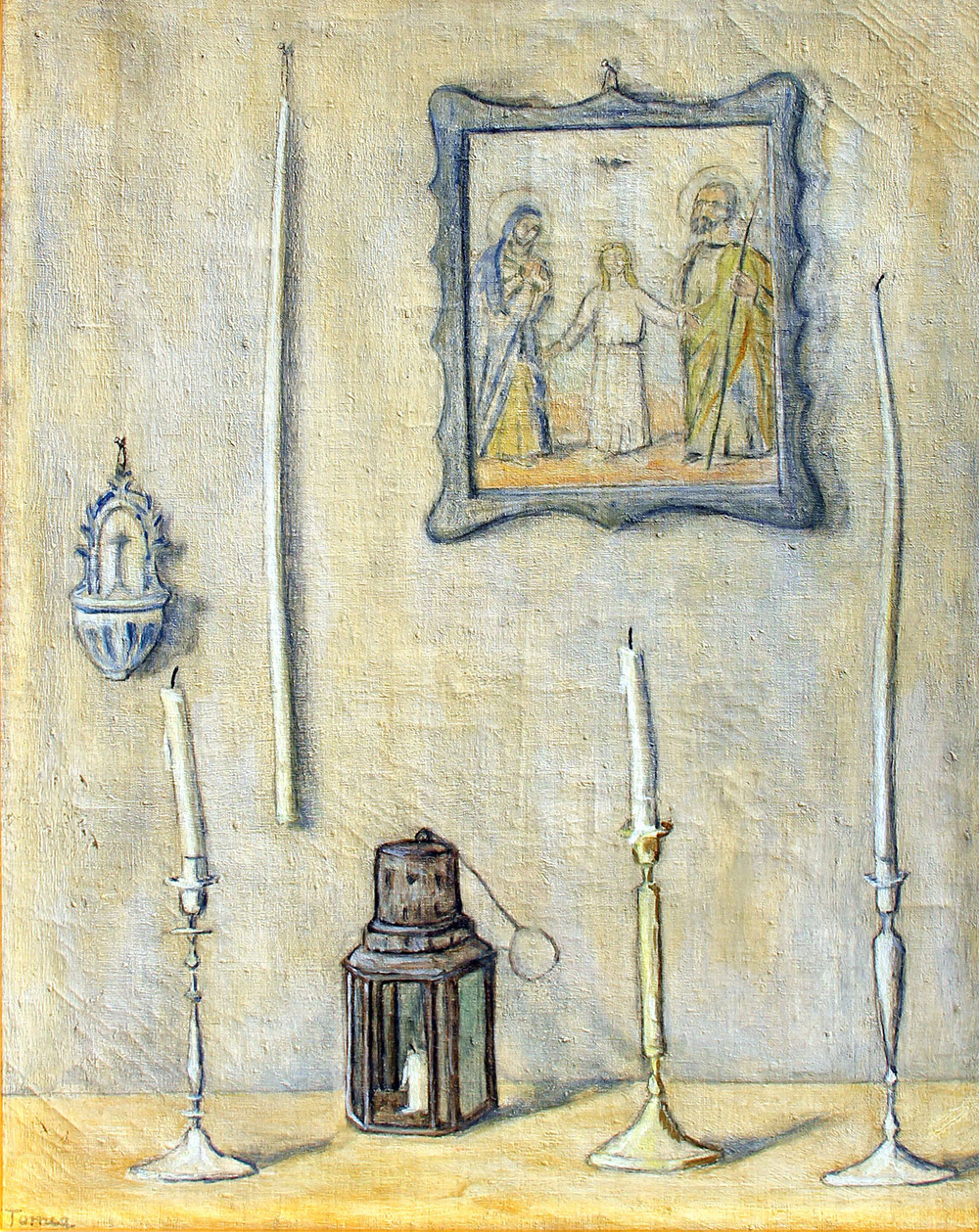 Fiorenzo TOMEA (Zoppè di Cadore, 1910 Milano, 1960) Sacra famiglia, 1951, olio su tela, cm. 90 x 70, Esposizioni: #VII Mostra nazionale pittura del Golfo, La Spezia; #Antologica, Associazione Piemonte Artistico e Culturale, Torino, 1960, Firma 'Tomea' (in basso a sinistra) #Firma, titolo, data 'F. Tomea, Sacra famiglia, 1951'; #etichetta della Galleria Annunciata, Milano; #etichetta della Associazione Artisti d'Italia; #etichetta della Associazione Piemonte Artistico e Culturale; #etichetta della VII Mostra Nazionale d'Italia Golfo della Spezia; #etichetta della Manifestazione leonardesca; #timbro della galleria La Panchetta, Bari (al retro) Autentica della moglie Maria Camilla Tomea, in data 9 dicembre 1968
