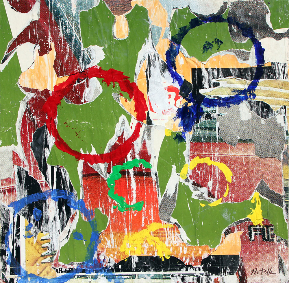 Mimmo ROTELLA (Catanzaro 1918 Milano 2006) Giochi sardi, 1990, decollage su tela, cm. 80 x 78, T. Mielke 'Mimmo Rotella', a cura dello Studio d'arte Cannaviello, Milano, 1998, Firma 'Rotella' (in basso a destra) #Misure, titolo, data '80 x 78, Giochi sardi, 1990' (al retro) Autentica a cura di Enzo Cannaviello, Milano