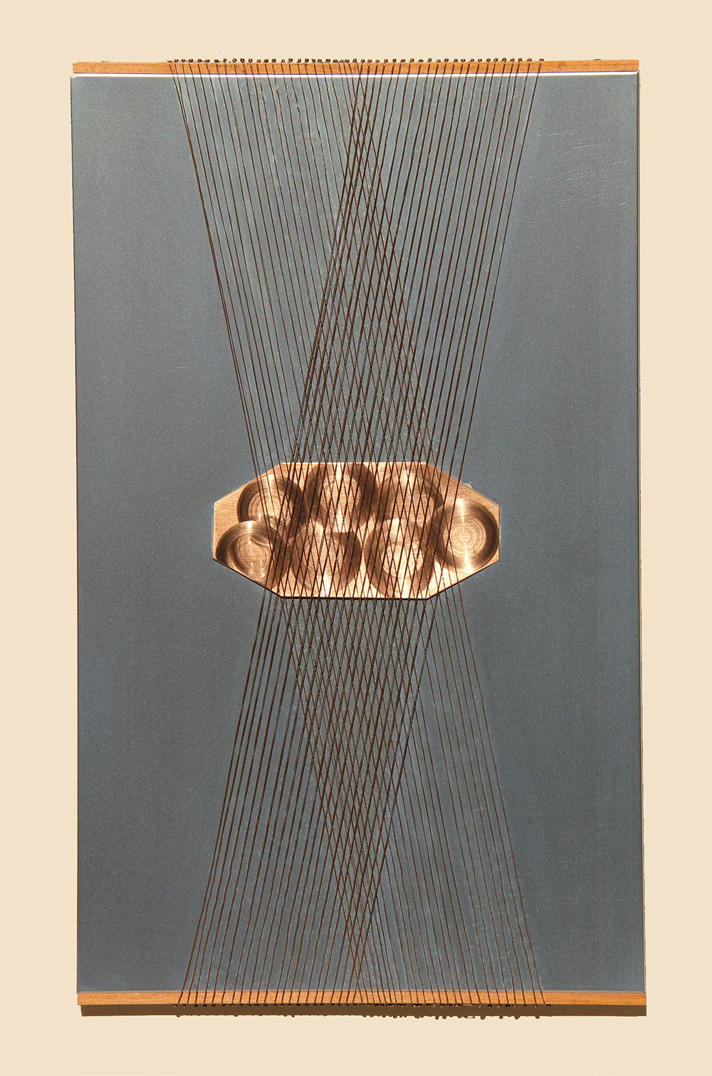 Antonio SAPORITO (Rocchetta S. Antonio (FG), 1940 ) Tessitura in rame, 2008, acciaio e rame su tavola, cm. 85 x 60, 'Spaziale geometrico', 2010, p.66 , Numerazione, iniziali, titolo, tecnica, misure, data, firma 'N. 104, A.S., tit.=Tessitura in rame, tec.=acciaio e rame, mis.=66x41, anno=2008, Antonio Saporito' (al retro)