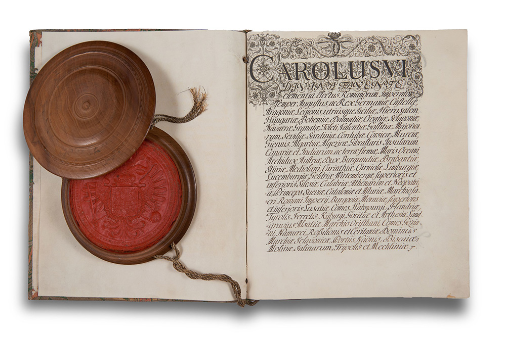 [ASBURGO, Carlo VI di (1685-1740)] -- Imponente bolla pergamenacea con firma autografa di Carlo VI d'Asburgo, Imperatore del Sacro Romano Impero e Re di Napoli. Data topica e cronica: Vienna, 22 novembre 1715. Nome del redattore della bolla: Petrus Josephus Dolberg. Incipit: "Carolus VI Divina Favente Clementia Electus". Bellissima bolla manoscritta su pergamena dell'imperatore Carlo VI, padre di Maria Teresa d'Austria, in cui conferma a Carlo Pacecco Carafa i titoli già assegnati nel 1420 al suo antenato Antonio Carafa dalla Regina di Napoli, Giovanna d'Angiò. Pergamena sbiancata (330 x 270mm), costituita da 46 fogli (comprese le guardie, coeve pergamenacee). Scrittura corsiva molto calligrafica e posata. Bellissimo fregio in inchiostro nero a motivi floreali che racchiude l'incipit "Carolus VI Divina Favente", sovrastato dallo stemma regio con due aquile coronate. Specchio di scrittura 230 x 185mm, rr. 21; tracce della rigatura in matita. La bolla è rilegata in tessuto di seta e fili d'oro, unita a uno stemma imperiale in ceralacca (diametro mm 140) conservato nell'originale scatola in legno (con un altro sigillo in ceralacca rimasto parzialmente conservato). Entro scatola originale in metallo. Stato di conservazione molto buono. Fine manuscript on parchment by the Emperor Charles VI confirming to Carlo Pacecco Carafa the titles already assigned in 1420 to his ancestor Antonio Carafa from Giovanna d'Angiò, Queen of Naples. 46pp. including the endpapers in contemporary vellum. Elaborate silk binding with the Emperor's arms in a wax seal, preserved in its original wooden box. In fine condition.