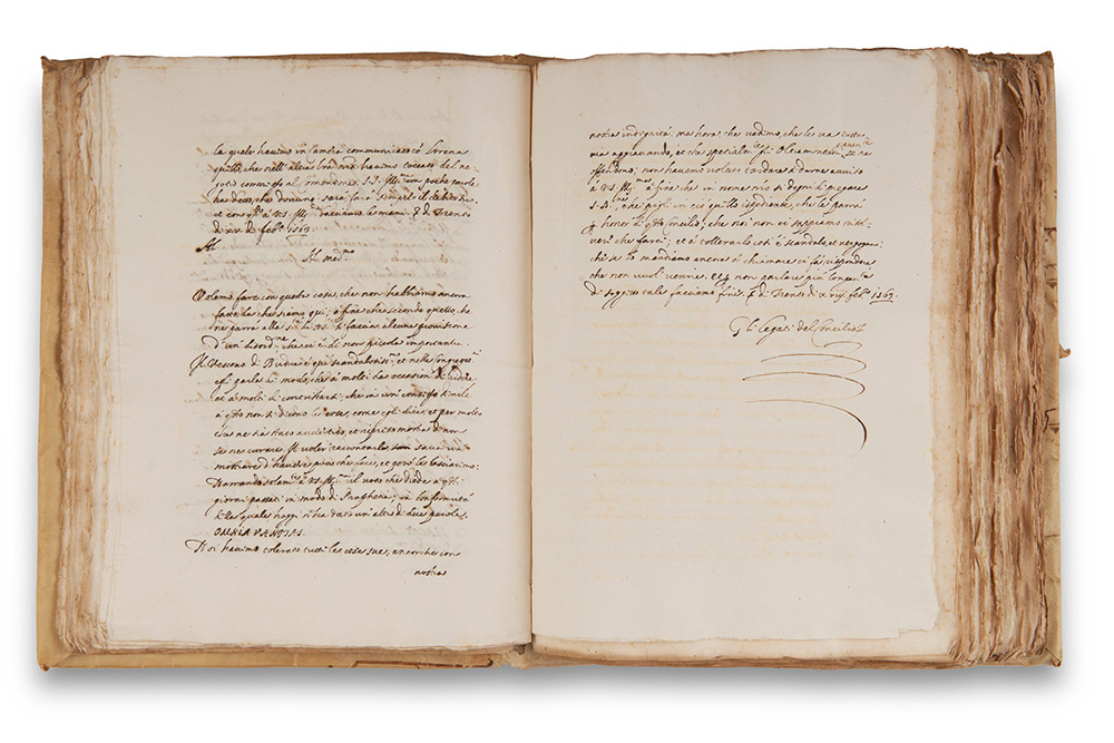 [CONCILIO DI TRENTO] -- Manoscritto. Acta Concilii Tridentini. Secoli XVII (stima desunta su base paleografica). Esemplare manoscritto contenente gli Atti del Concilio di Trento (1545-1563), nato dall'accorpamento di diverse unità codicologiche, non disposte seguendo l'ordine cronologico degli scritti canonici. Manoscritto su carta vergellata e filigranata (cc. 418; 275 x 205mm [ma dimensioni lievemente variabili]). Quasi dieci mani diverse concorrono a redigere il volume, tutte riconducibili al secolo XVII, caratterizzate da alto livello di corsività e inclinazione dell'asse a destra. Segnatura e rigatura assenti. Inchiostro marrone scuro di tonalità differenti. Disposizione del testo a piena pagina. Fioriture, bruniture e aloni determinati dall'acidità dell'inchiostro. Legatura in piena pergamena di riuso. Titolo manoscritto al dorso; bindelle coeve su entrambe le coperte. Taglio con barbe. Provenienza: Luisa Sormani Busca Arconati Visconti (1855-1928; ex libris). A 17th-century manuscript containing the acts of the "Concilio di Trento". Around 10 different hands compiled the manuscript (some spotting and browning).