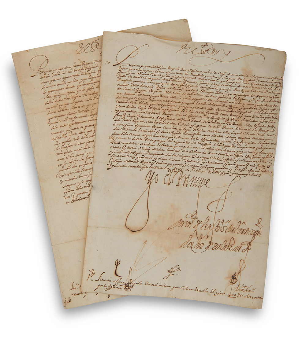 [FILIPPO II di Spagna (1527-1598)] -- Due documenti in lingua spagnola dell'epoca di Filippo II di Spagna. Spagna-Italia, fine secolo XVI. I documenti testimoniano i rapporti intercorsi fra lo Stato di Milano e il Regno di Spagna. Entrambi sono controfirmati da Don Luis De Salazar, inoltre: il primo è stato redatto nel 1595, firmato El Rey; il secondo nel 1598, firmato El principe. Entrambi recano a piè di pagina la "Licencia": nel primo documento quella del Presidente del Senato di Milano Giacomo Riccardi originario di Lodi, nel secondo del milanese Giovanni Battista Riccardi. Manoscritti su carta vergellata e filigranata (cc. 4; 302 x 210mm). Due diverse scritture calligrafiche di notevole nitidezza. Inchiostro marrone. Un documento è intaccato da macchie di umidità nella c. 2verso. Lievi bruniture sul supporto. Two documents on paper in Spanish. The documents are a testimony of the relations between the State of Milan and the Reign of Spain. Both are countersigned by Don Luis de Salazar: the first, written in 1595, is signed "El Rey"; the second, written in 1598, is signed "El principe".