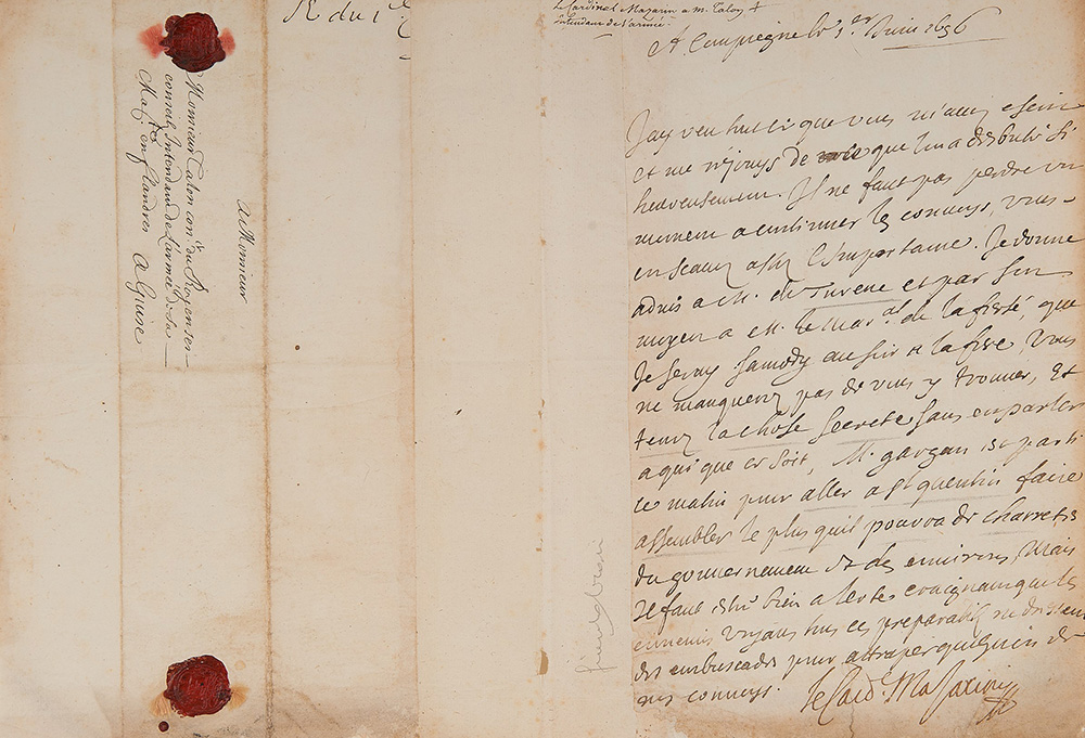 MAZZARINO, Giulio Raimondo - Jules Raymond Mazarin -(1602-1661). Lettera autografa indirizzata a Monsieur Talon del Royensen Conseil e Intendant de l'Armée. Compiègne, giugno 1656. Interessante lettera autografa del Cardinale redatta nel periodo della Battaglia di Valenciennes, iniziata nel 18 maggio del 1656 e terminata con una sconfitta francese il 16 luglio dello stesso anno; protagonista è il Visconte di Turenne, menzionato da Mazzarino (r. 6) in relazione a preparativi bellici. Manoscritto su carta vergellata e non filigranata (cc. 2; 223 x 163mm). Redatto interamente dal Cardinale in una calligrafia posata e inclinata a destra, in inchiostro ocra. Indirizzo al verso in altra mano. Due sigilli ben conservati in ceralacca rossa con fili di seta. Restaurato al margine. Corredato di certificato di autenticità del dott. Giancarlo Moroni, membro del Collegio Lombardo Periti Esperti Consulenti. A letter in French addressed to Monsieur Talon during the battle of Valenciennes. Together with a certificate of authentication.