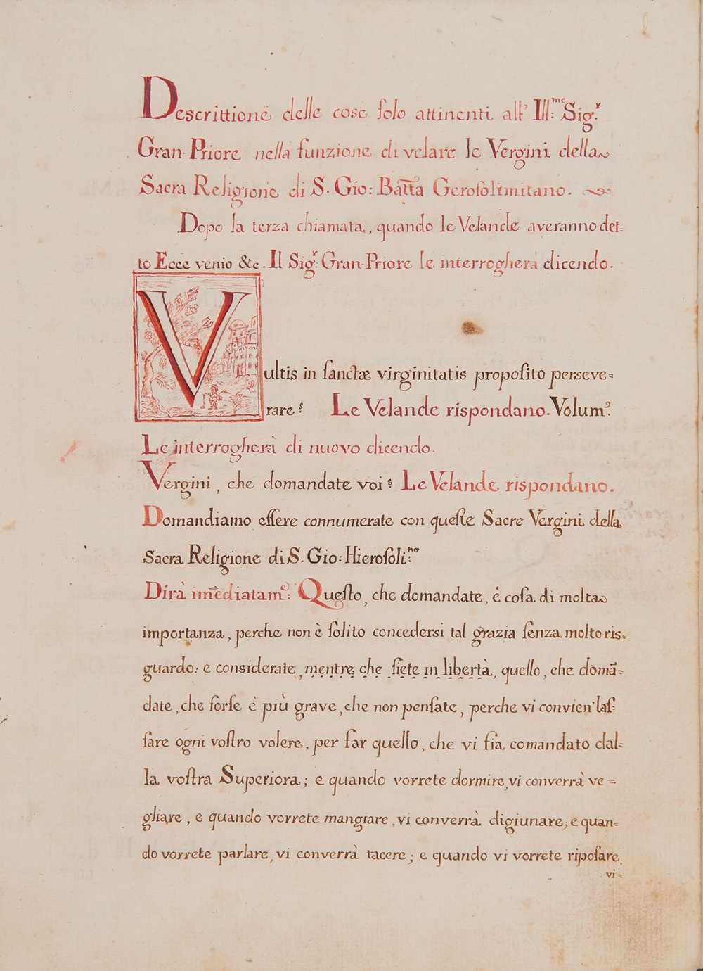 [ORDINE di SANTO STEFANO] Ordine, per vestimento di Monache [dell'Ordine di S. Stefano]. Segue: Forma della Professione delle Monache Corali della Religione di S. Giovanni Battista. Segue: Descrittione delle cose solo attinenti all'Ill. Sig. Gran Priore nella funzione di velare le Vergini. Segue: Benedizione delle novelle (inc.: Auxiliante Domino et Salvatore nostro Jesu Christi). Pisa: secolo XVII. Interessante manoscritto composito, relativo al rituale di vestizione delle Suore Benedettine dell'Ordine di S. Stefano. Le vicende del codice (di cui si ha traccia nel contropiatto anteriore) ricollegano il manoscritto al Convento Benedettino di S. Matteo in Pisa. Splendido stemma a tutta pagina dell'Ordine di S. Stefano eseguito all'acquarello in rosso e nero (c. 2recto); segue il titolo (c. 3recto) in rosso entro cornice; sempre nella I unità codicologica tre carte con testo e musica gregoriana. Cartigli manoscritti acquarellati alle cc. 3recto, 11verso, 19verso; bellissimo capolettera istoriato in inchiostro rosso alla c. 18recto. Manoscritto cartaceo (cc. 34; 285 x 202mm), composto di quattro unità codicologiche (I: cc. 1-13; II: cc. 14-17; III: cc. 18-21; IV: 22-26; cc.27-34: bianche). Cinque copisti anonimi si alternano nella redazione del codice: mani denotate da diversi livelli di calligrafia e posatezza, riconducibili al secolo XVII. Legatura ottocentesca in piena pelle; dorso con nervatura visibile. Legatura lievemente allentata. An interesting manuscript about the Benedictine sisters of the Order of Saint Stephen. The manuscript is connected with the Benedictine Convent of Saint Matthew in Pisa.