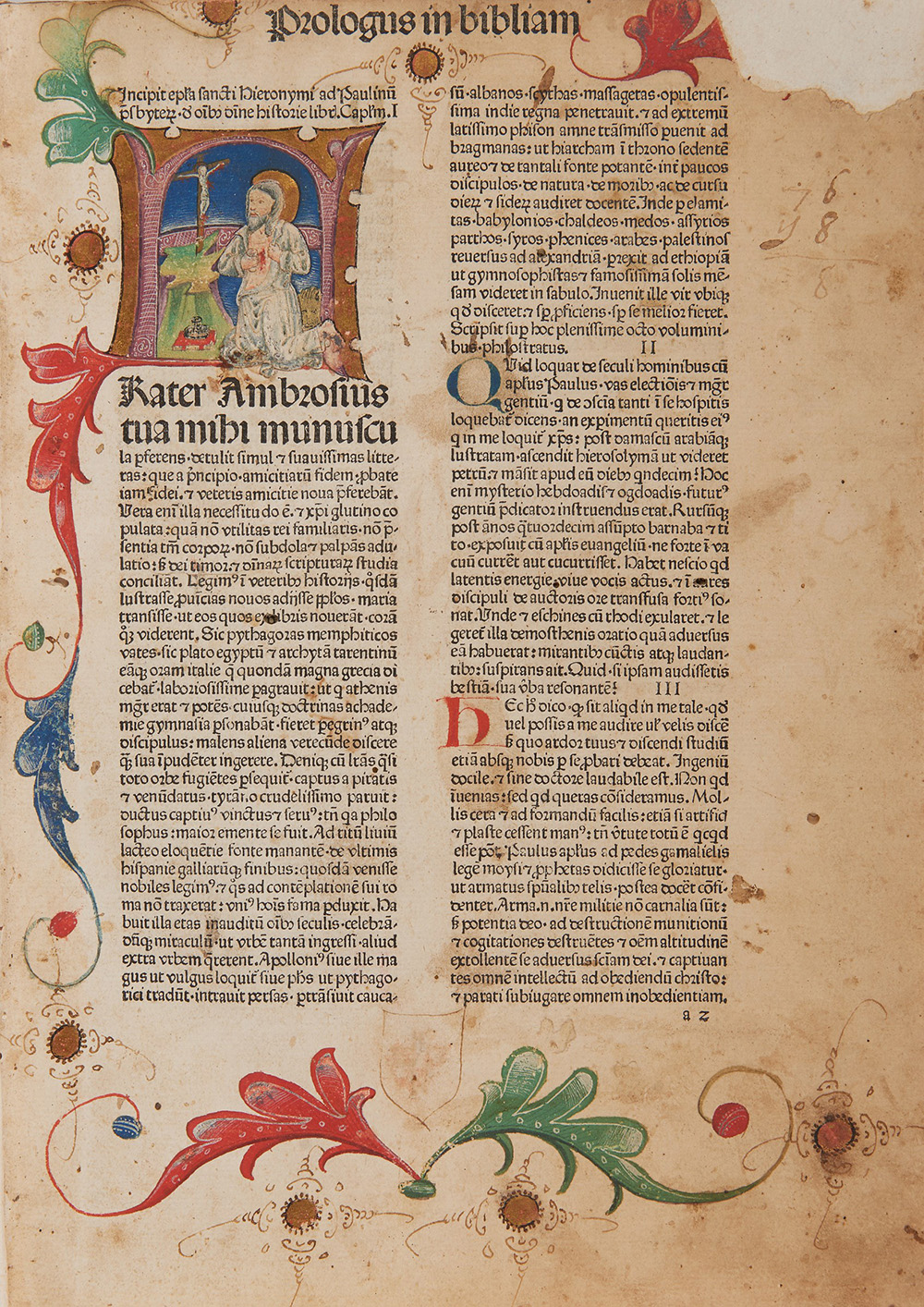 MARCHESINO, Giovanni (XIV sec.). Mammotrectus super Bibliam. Venezia: Franciscus Renner de Heilbronn e Nicolaus de Frankfordia, 1476. La copia Arconati Visconti di questa rara Bibbia con le iniziale miniate. 4to (270 x 194mm). Grande iniziale istoriata raffigurante San Girolamo, con i colori dominanti del blu e oro, fregio a motivi floreali in rosso, verde, blu e oro, grande lettera incipitaria “I” in inchiostro blu e capilettera rubricati in rosso e blu (alcuni fogli riparati al margine interno e titolo riparato all’angolo superiore, margine superiore rifilato, qualche macchia e foro di tarlo, senza la prima e ultima bianca). Legatura moderna in pelle, tagli marmorizzati (qualche graffio). Provenienza: annotazioni antiche -- Luisa Sormani Busca Arconati Visconti (1855-1928; ex libris). Alla copia digitalizzata della Biblioteca Vaticana con cui abbiamo comparato questa copia sembrerebbe mancare la carta C1. The Arconati Visconti copy of this rare bible with illuminated initials. Large historiated initial of Saint Girolamo in blue and gold. Large letter "I" in blue, rubricated in red and blue. Modern calf, marbled edges (light scuffing). Provenance: some early annotations -- Luisa Sormani Busca Arconati Visconti (1855-1928 bookplate). The digitized copy at the Vatican with which we compared this copy lacks C1.