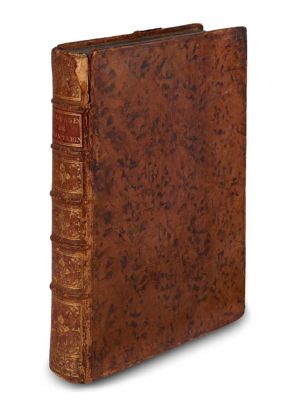 MONTAIGNE, Michel Eyquem de (1533-1592). Journal du voyage. Roma e Parigi: Le Jay, 1774. Seconda edizione in 4to di questa relazione di viaggio. Il manoscritto fu ritrovato 200 anni dopo la morte dell’autore dall’abate Prunis e pubblicato a cura di Antoine Gabriel Meunier de Quelon. Ben quattro edizioni furono stampate nello stesso anno. 4to (283 x 210mm). Occhiello, ritratto in antiporta inciso in rame dell'autore da Aubin. Legatura in pelle coeva, tagli marmorizzati (lieve difetto al dorso). Provenienza: timbro rimosso al frontespizio. Brunet III: 1841. MONTAIGNE, Michel Eyquem de (1533-1592). Journal du voyage. Roma e Parigi: Le Jay, 1774. Seconda edizione in 4to di questa relazione di viaggio. Il manoscritto fu ritrovato 200 anni dopo la morte dell’autore dall’abate Prunis e pubblicato a cura di Antoine Gabriel Meunier de Quelon. 4to (283 x 210mm). Occhiello, ritratto in antiporta inciso in rame dell'autore da Aubin. Legatura in pelle coeva, tagli marmorizzati (lieve difetto al dorso). Provenienza: timbro rimosso al frontespizio. Brunet III: 1841. Second 4to edition of Montaigne's 16th-century journey; his manuscript was found nearly 200 years after his death by Abbott Prunis, and was published by Antoine Gabriel Meunier de Quelon. Four editions were published the same year. Brunet III: 1841.